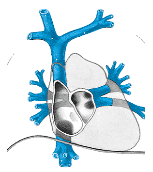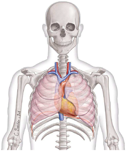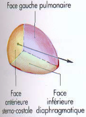 | Projection | – Se projette du 3ème au 6ème espace intercostal, en regard des vertèbres T6 à T8. – Qui repose via le péricarde sur le centre phrénique du diaphragme. |