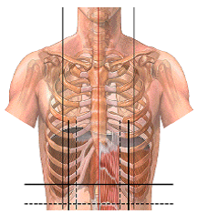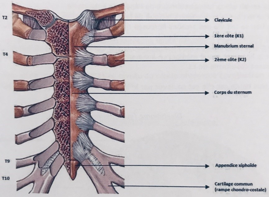 | Paroi antérieure : Sternum | Os plat divisé en 3 parties : – Partie supérieure : manubrium –> se projette sur le bord inférieur de T2, –> reçoit l’articulation de la 1ère côte (K1) et de l’extrémité médiale de la clavicule. – Corps –> se projette du bord inférieur de T4 à T9, –> reçoit les articulations des cartilages costaux de K1 à K10. – Processus xyphoide –> se projette sur T9/T10, –> sert, à sa partie postérieure, à l’insertion du diaphragme. ![]() |