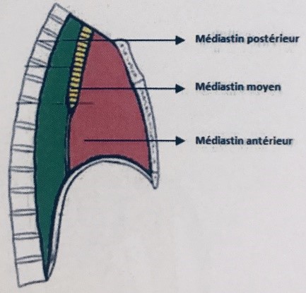 | Médiastin | – Partie centrale de la cavité thoracique située entre les deux cavités pleurales. – Région de passage contenant tous les viscères thoraciques à l’exception des poumons. Sur un plan anatomique, le médiastin est divisé en trois sous-régions, selon deux plans frontaux, passant en avant et en arrière de la trachée : – Médiastin antérieur avec le cœur entouré du péricarde et les gros vaisseaux (+ loge thymique). – Médiastin moyen avec l’arbre trachéo-bronchique. – Médiastin postérieur avec l’aorte thoracique descendante, l’œsophage thoracique, le conduit thoracique et le système azygos (+ nerfs vagues et phréniques). Coupe transversale ![]() Coupe sagittale ![]() |