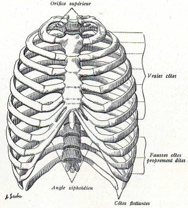 | Paroi latérale : 12 côtes | Réparties en 3 catégories : – Vraies côtes (K1 à K7) : –> articulées en arrière par leur tête et leur corps aux vertèbres thoraciques et en avant au sternum. – Fausses côtes (K8 à K10) –> ayant un cartilage commun avec K7 et une articulation normale en arrière. – Côtes flottantes (K11-K12) –> non articulées en avant. ![]() |