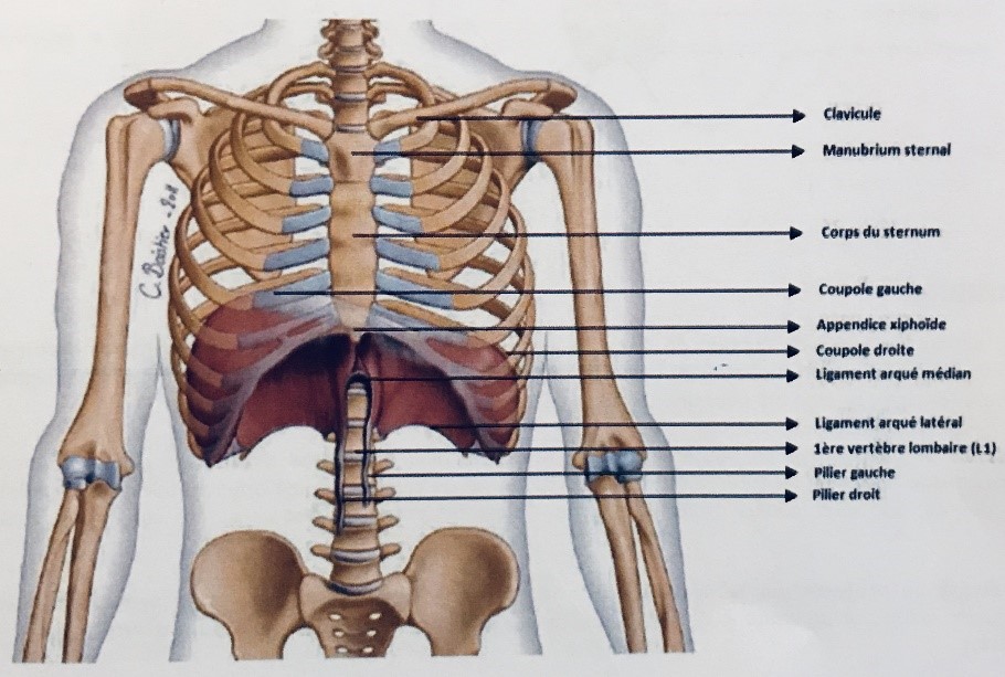 | Limite inférieure : diaphragme | – Paroi inférieure du thorax. – Sépare la cavité thoracique et abdominale. – Muni de quelques orifices (= hiatus), cependant c’est une cloison quasiment étanche. Topographie de face : voute concave formée de 2 coupoles musculaires réunies en un centre tendineux – Droite : soulevée par le foie, en regard du 4ème espace intercostal à l’expiration. – Gauche : soulevée par la rate, en regard du 5ème espace intercostal à l’expiration. Vue antérieure ![]() Muscle digastrique : – Partie centrale tendineuse en forme de trèfle (une feuille = foliole) : folioles antérieure, droite et gauche (qui sont postérieures). – Partie musculaire périphérique : –> sternale, s’insérant sur face postérieure du processus xyphoide, –> costale, s’insérant sur : 1) face interne cartilages costaux 2) ligament arqué latéral –> vertébrale s’insérant sur : 1) colonne lombale/piliers fibreux à la face antérieure des vertèbres : *pilier droit naît en regard du corps vertébraux de L3 à L1 *pilier gauche naît en regard du corps vertébraux de L2 à L1 2) et ligaments arqués :médianmédial. Vue inférieure ![]() Innervation : nerfs phréniques. Rôle : mécanique ventilatoire = muscle de l’inspiration => l’expiration naturelle (ou non forcée) est un mouvement passif. |