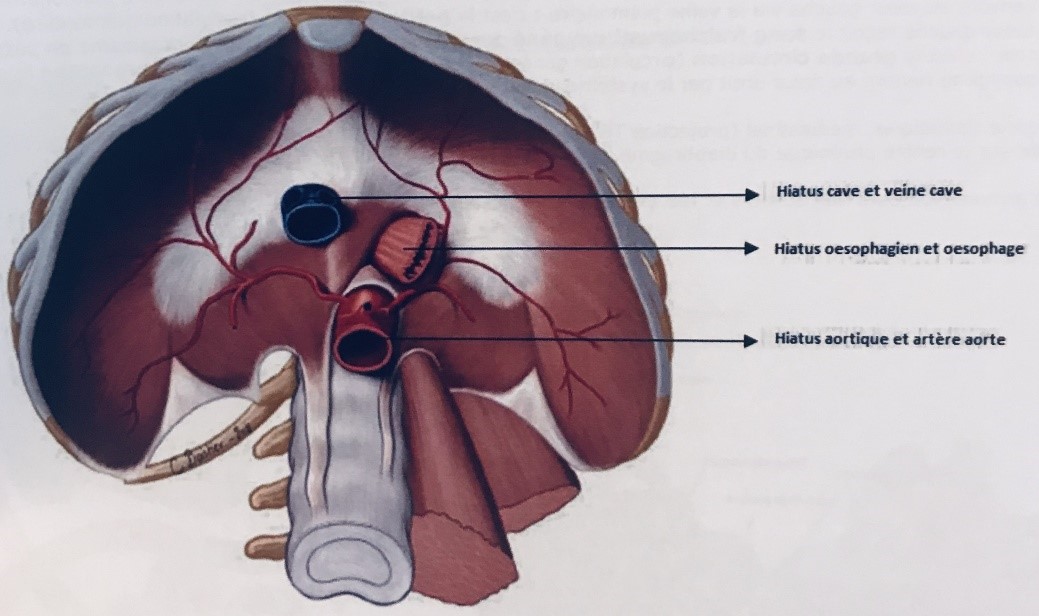 | Hiatus diaphragmatiques | Aortique – Fibreux non contractile et inextensible (pour éviter la compression de l’aorte). – En regard du T12. – Formé par l’entrelacement des piliers et du ligament arqué médian. – Contient l’aorte descendante et derrière conduit thoracique (passage de la lymphe). Œsophagien – Musculaire, extensible. – En regard du T10. – Formé par des fibres musculaires issues des piliers, surtout droit ++ – Contient œsophage + nerfs vagues (pneumogastrique X) droit et gauche. – Fronde anti-reflux, rôle dans la digestion et l’innervation de l’estomac. De la veine cave inférieure (VCI) – Situé dans le centre tendineux (non contractile), entre foliole antérieure et droite. – En regard du T9. – Contient VCI + nerf phrénique droit. – Orifice de passage de la VCI de l’abdomen au thorax. Vue inférieure ![]() |