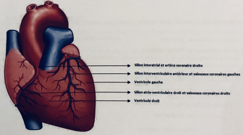 | Vascularisation du cœur | – Artères vascularisant le cœur = artères coronaires. – Absorbant 5 à 10% du débit cardiaque. – Naissent de l’aorte et constituent les premières bifurcations aortiques. – Cheminent dans sillons du cœur et protégées par la graisse cardiaque. – Réseau anastomotique entre les artères coronaires gauche et droite pour former un système continu si l‘une d’elles est défaillante. – Drainées par les veines coronaires qui débouchent sur l’atrium droit. – Test médical : coronarographie. – Pathologies : angor, IDM. Vascularisation sanguine (vue antérieure et postérieure) ![]() |