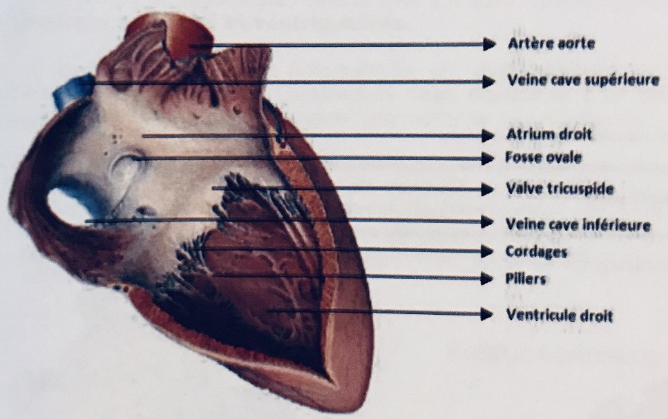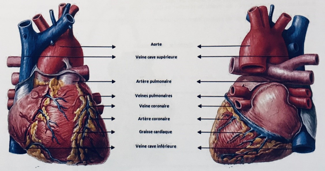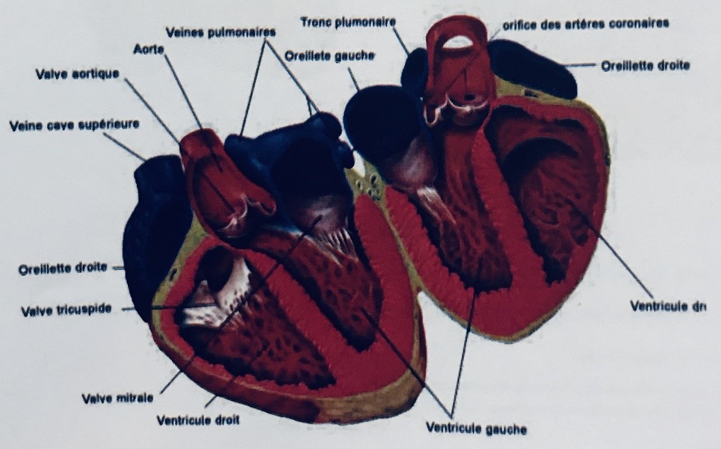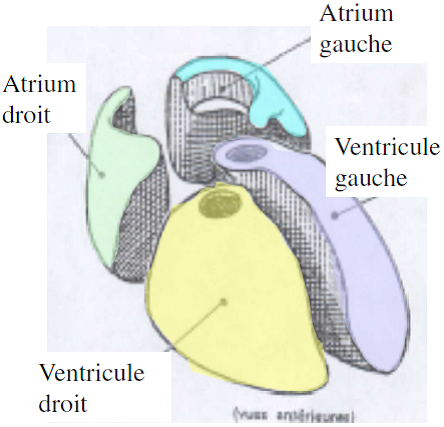 | Définition | – Muscle creux composé de quatre cavités : –> 2 atriums, et –> 2 ventricules. – Subdivisé en deux parties non communicantes par une cloison étanche ou septum –> le cœur droit (atrium droit + ventricule droit qui communiquent), –> le cœur gauche (atrium gauche + ventricule gauche qui communiquent). – Est une cavité unique à son origine et se divise au fur et à mesure de la croissance de l’embryon. ![]() |