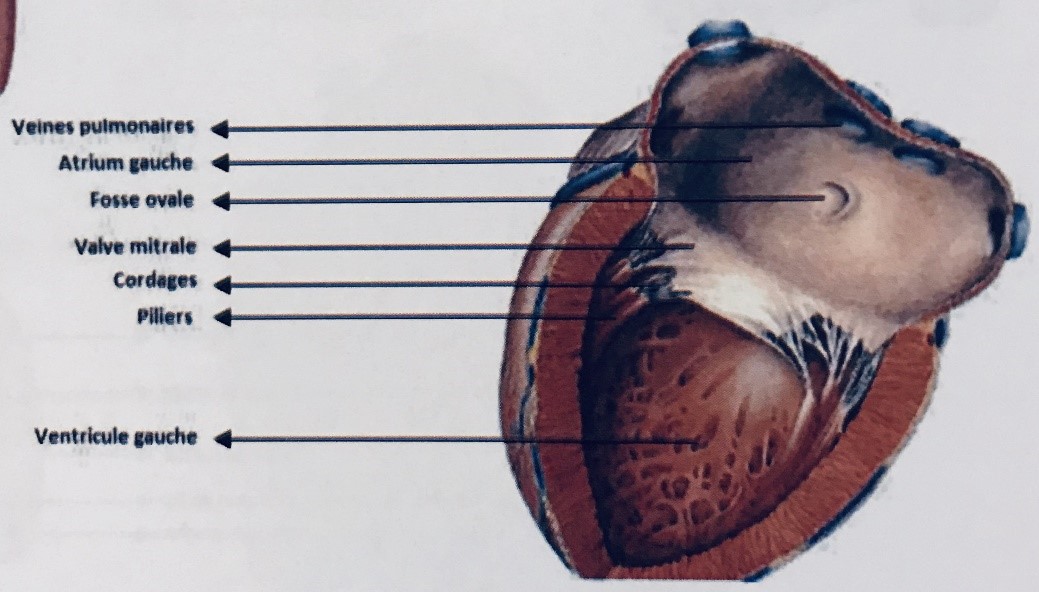 | Morphologie interne | 4 cavités – Cœur gauche : atrium gauche + ventricule gauche. – Cœur droit : atrium droit + ventricule droit. Cloisons – Septum inter-atrial. – Septum atrioventriculaire. – Septum interventriculaire: –> Partie musculaire –> Partie membraneuse. ![]() Cavités cardiaques ![]() Des veines viennent s’aboucher dans les atriums : – Veine cave supérieure et inférieure dans l’atrium droit. – Veines pulmonaires supérieures droite et gauche et inférieures droite et gauche dans l’atrium gauche. Des artères émergent des ventricules : – L’aorte émerge du ventricule gauche. – L’artère pulmonaire émerge du ventricule droit. La face interne: – des atriums est lisse. – des ventricules est hérissée de saillies musculaires ou piliers servant pour certains d’attache aux cordages permettant l’ouverture et la fermeture des valves fermant la communication (ostium) entre les atriums et les ventricules ou valves atrio-ventriculaires. Cœur droit ouvert (vue antéro-latérale droite) ![]() Cœur gauche ouvert (vue postéro-latérale gauche) ![]() Orifices – Entre atriums et ventricules = valves atrio-ventriculaires : –> tricuspide à droite –> mitrale à gauche. – Valves sigmoïdes artérielles (naissance des gros vaisseaux) : –> pulmonaire à droite (AP) –> aortique à gauche => elles empêchent le reflux de sang. Valves cardiaques (vue supérieure) ![]() |