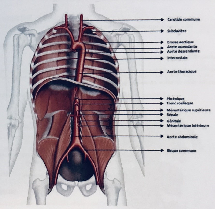 | Système artériel – Aorte et ses collatérales | L’aorte est l’artère la plus importante du corps et est responsable de la vascularisation systémique. On distingue selon leur localisation anatomique, plusieurs tronçons : – Aorte ascendante – Arc aortique (crosse de l’aorte) – Aorte thoracique (descendante) – Aorte abdominale (descendante). L’aorte donne des collatérales qui vascularisent les différents organes : – Artères carotides communes – Artères subclavières – Artères intercostales – Artères phréniques – Tronc coeliaque – Artères rénales – Artère mésentérique supérieure – Artère mésentérique inférieure – Artères génitales (ovariques ou testiculaires) – Artères iliaques communes. ![]() |