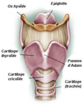 | Larynx | – Conduit composé de différents cartilages : –> Thyroïde (forme d’un livre ouvert en arrière) –> Cricoïde (inférieur au thyroïde, en forme d’anneau) –> Épiglottique (sert à obstruer les voies aériennes lors de la déglutition) –> Arythénoïde (forme pyramidale reposant sur la partie postérieure du cricoïde) –> Corniculé. – Les cartilages sont reliés par des membranes et des ligaments et actionnés par des muscles. – Organe de la phonation et de la respiration. ![]() |