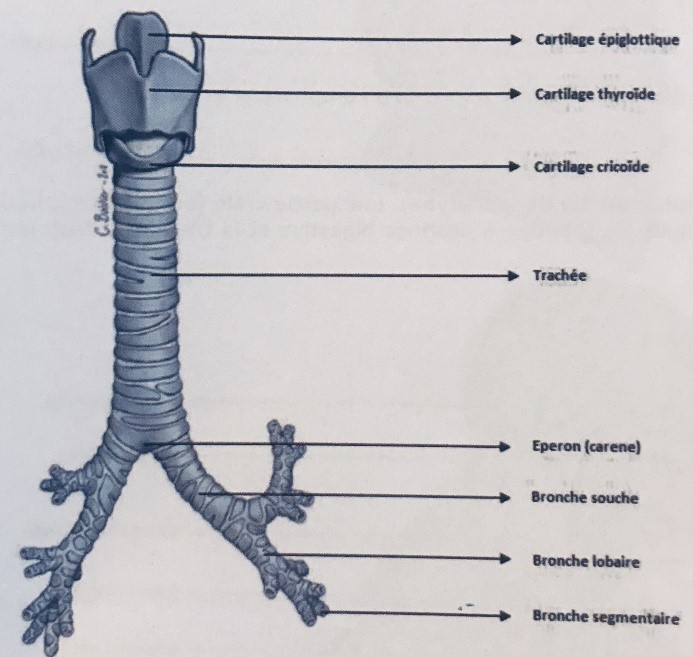 | Trachée | – Conduit élastique fait d’anneaux superposés en forme de U fermé en arrière par un muscle. – S’étend en haut du cartilage cricoïde du larynx en regard de C6 à en bas sa division terminale en deux bronches souches en regard de T5. |