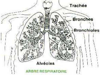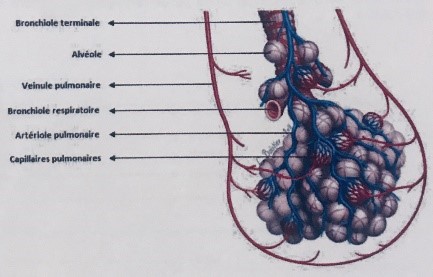 | Bronches | Les bronches souches sont issues de la division de la trachée. La bronche souche droite est plus verticale que la gauche formant avec la ligne médiane un angle de 25-30°. Les bronches souches entrent dans le poumon par le pédicule pulmonaire et vont se ramifier en : – à droite : –> bronche lobaire supérieure, –> bronche lobaire moyenne, –> bronche lobaire inférieure. – à gauche : –> bronche lobaire supérieure, –> bronche lobaire inférieure. Chaque bronche lobaire se divisera elle-même : – en bronches segmentaires qui se diviseront à leur tour – en bronches sub-segmentaires – puis en bronchioles pulmonaires (fins conduits dépourvus de cartilages) se terminant par une dilatation : – le sac alvéolaire : –> petit sac terminal se gonflant à l’inspiration et se vidant à l’expiration, entouré par des capillaires –> constitué d’alvéoles pulmonaires, correspondant aux reliefs de la paroi du sac alvéolaire. ![]() Sac alvéolaire ![]() |