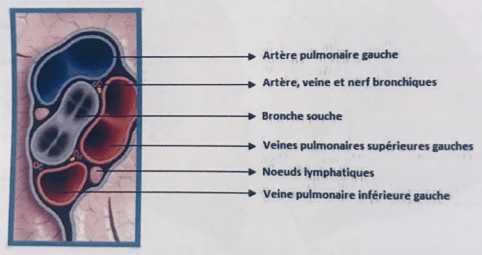| Morphologie interne | Le pédicule pulmonaire est constitué par les éléments pénétrant ou sortant du poumon au niveau du hile pulmonaire. On distingue : – un pédicule fonctionnel, – un pédicule nourricier. Pédicule du poumon (vue médiale) ![]() Pédicule fonctionnel – La bronche souche. – Artère pulmonaire droite ou gauche. – Veines pulmonaires supérieures et inférieures. Pédicule nourricier – Artères bronchiques. – Veines bronchiques (antérieure et postérieure). – Nerfs bronchiques. – Lymphonoeuds bronchiques. Le parenchyme pulmonaire est subdivisé en : – Lobes: 3 à droite, 2 à gauche (suivant la division des bronches lobaires). – Segments : –> 10 à droite et à gauche (suivant la division en bronches segmentaires). –> Chaque segment est : 1) ventilé par une bronche segmentaire, 2) vascularisé par une artère bronchique segmentaire, 3) drainé par une veine bronchique intersegmentaire. – Lobules pulmonaires prédominant à la périphérie du poumon et contenant les bronchioles. – Acini : unités terminales contenant les sacs alvéolaires. Segments pulmonaires ![]() |