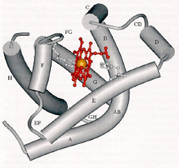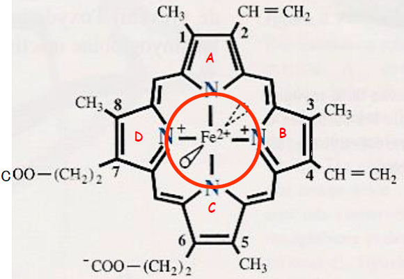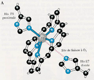 Le fer est sous forme ferreuse Fe2+ (ferromyoglobine) et dispose de 6 liaisons de coordination dont 4 avec l’hème.