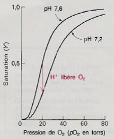 1)L’affinité de l’hémoglobine pour O2 est diminuée par la diminution du pH (augmentation de [H+])