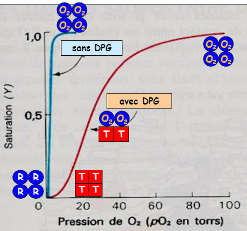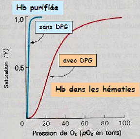 En absence de DPG, l’hémoglobine perd ses propriétés de coopérativité, et son comportement est similaire à celui de la myoglobine.