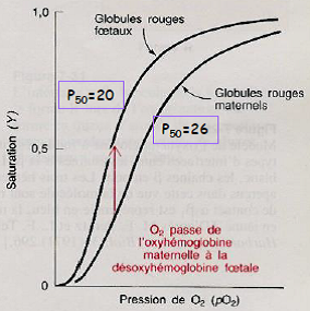 L’affinité de l’hémoglobine fœtale (HbF = α2γ2) pour O2 est supérieure à celle de l’hémoglobine maternelle (HbA = α2β2).