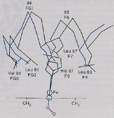 Ce mouvement est transmis à l’histidine proximale et à l’ensemble de la chaîne polypeptidique par déplacement de proche en proche.