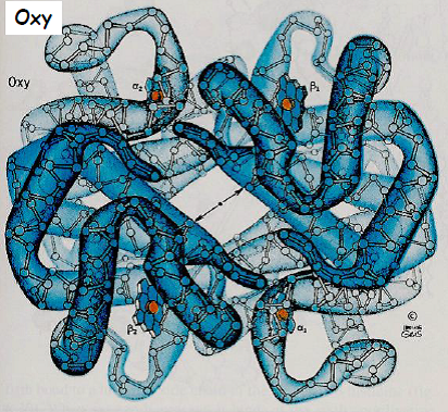 | Etat relâché R a une forte affinité pour O2 | Etat tendu T a une faible affinité pour O2 |