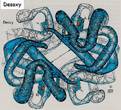 | Etat tendu T | ![]() | – faible affinité pour O2 (Hb desoxygénée) – stabilisée par le DPG, le CO2 et les protons H+ |