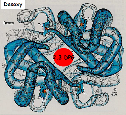 Le 2,3 DPG bloque l’hémoglobine en position T en se fixant dans l’espace libre entre les 4 sous-unités. C’est pourquoi il interfère avec la coopérativité.