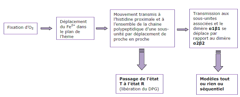 | Modèle du « tout ou rien » ou modèle symétrique | Les 4 sous-unités sont initialement toutes à l’état T et la présence d’O2 déplace l’équilibre vers l’état R. Les 4 sous-unités passent toutes à l’état R et fixent l’une après l’autre l’O2. ![]() |