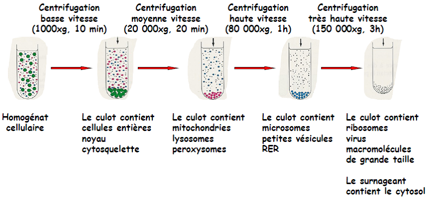 | Contenu du culot | Cellules entières Noyau Cytosquelette | Mitochondries Lysosomes Peroxysomes | Microsomes (= fragments de membranes) Petites vésicules RER | Virus Ribosomes Molécules de grande taille Remarque : le surnageant contient le cytosol |