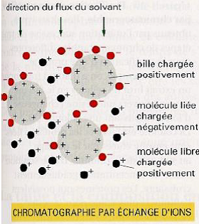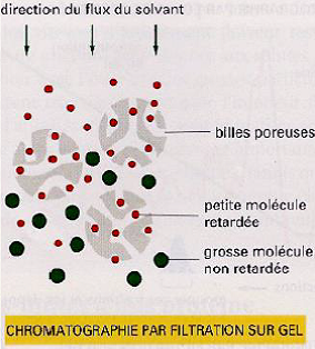 | Les billes sont chargés + ou – Elution par force ionique croissante | Les billes sont poreuses Séparation selon le poids ou la masse moléculaire Les grandes protéines font peu de chemin dans la colonne et sont élués en 1er alors que les petites protéines passent dans les billes et sont éluées en dernier. | Billes couplées à un ligand La protéine se lie à son ligand (anticorps ou enzyme) |
