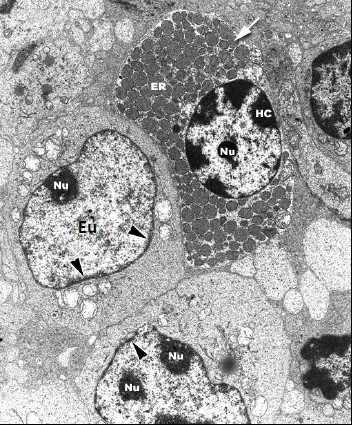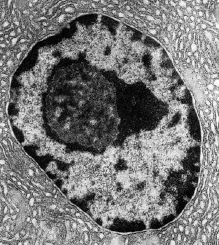 Chromatine plus ou moins dense aux électrons. Cellules de mammifère, MET.