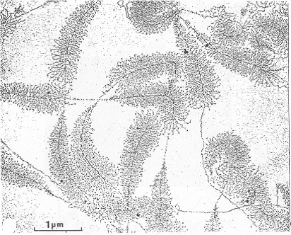 | Si plusieurs ARN polymérases « travaillent » à la chaîne sur le même gène, on obtient « des sapins de Noël » : | Etalement moléculaire du nucléole (synthèse des ARN ribosomiques)![]() |
