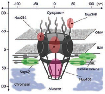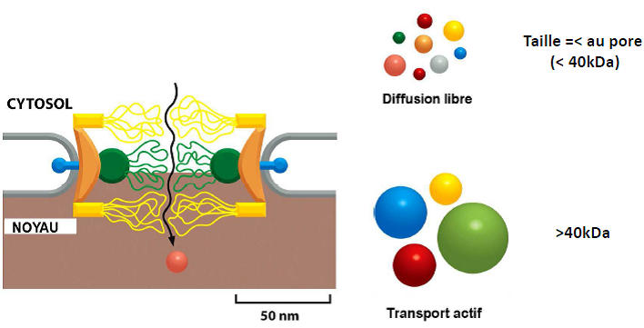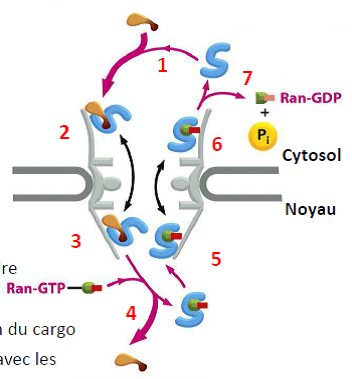 | Importation d’une protéine 1- Le cargo interagit avec le récepteur d’importation. 2- Interaction avec des acides aminés (FG) sur les filaments et les nucléoporines le long du pore nucléaire. 3- Passage dans le noyau. 4- Interaction du récepteur avec Ran-GTP & libération du cargo. 5- Ran-GTP & Récepteur d’importation interagissent avec les nucléoporines. 6- Passage dans le cytosol. 7- Hydrolyse du GTP en GDP+Pi et largage du récepteur d’import. | ![]() ![]() |
