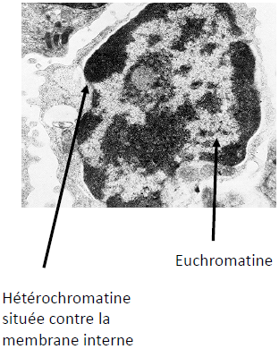| Hétérochromatine – Chromatine +/- condensée. – Partiellement périphérique. 2 types : – Constitutive (centromères, télomères, chromosome X) : pas transcrite. – Facultative : pas transcrite mais avec capacité de se transformer en euchromatine. | Euchromatine – Chromatine +/- décondensée. – Dispersée dans le nucléoplasme. Remarque : Aucune observation au microscope ne permet d’établir le degré de condensation de l’ADN. |