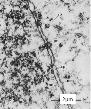 Photographie au MET d’une portion de la membrane interne de l’enveloppe nucléaire, ovocyte de xénope.