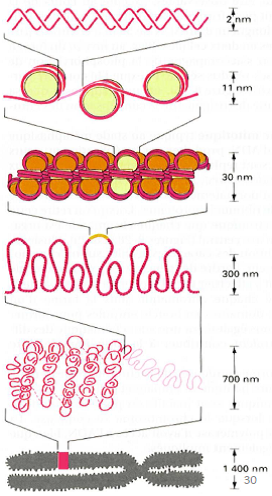 Chez l’Homme : génome 2,85 billions de nucléotides, 46 chromosomes => 2,5 mètres => Taille du noyau ? seulement quelques micromètres