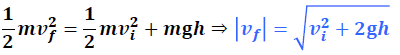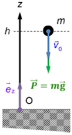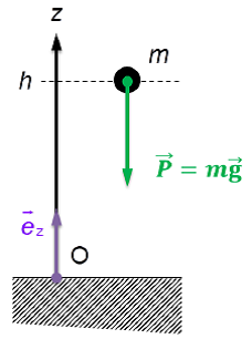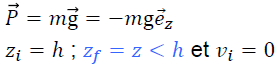 Considérons un corps de masse m, initialement à la hauteur z = h, qui tombe sous les effets de la gravité. Déterminons l’expression de sa vitesse d’arrivée au sol en nous servant des théorèmes des énergies :