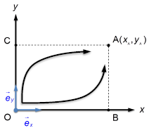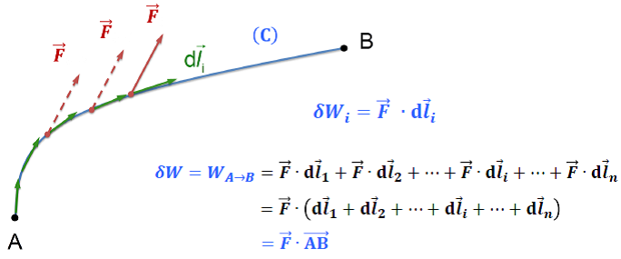 Pour un déplacement non rectiligne, on décompose le mouvement en une somme de déplacements infinitésimaux :